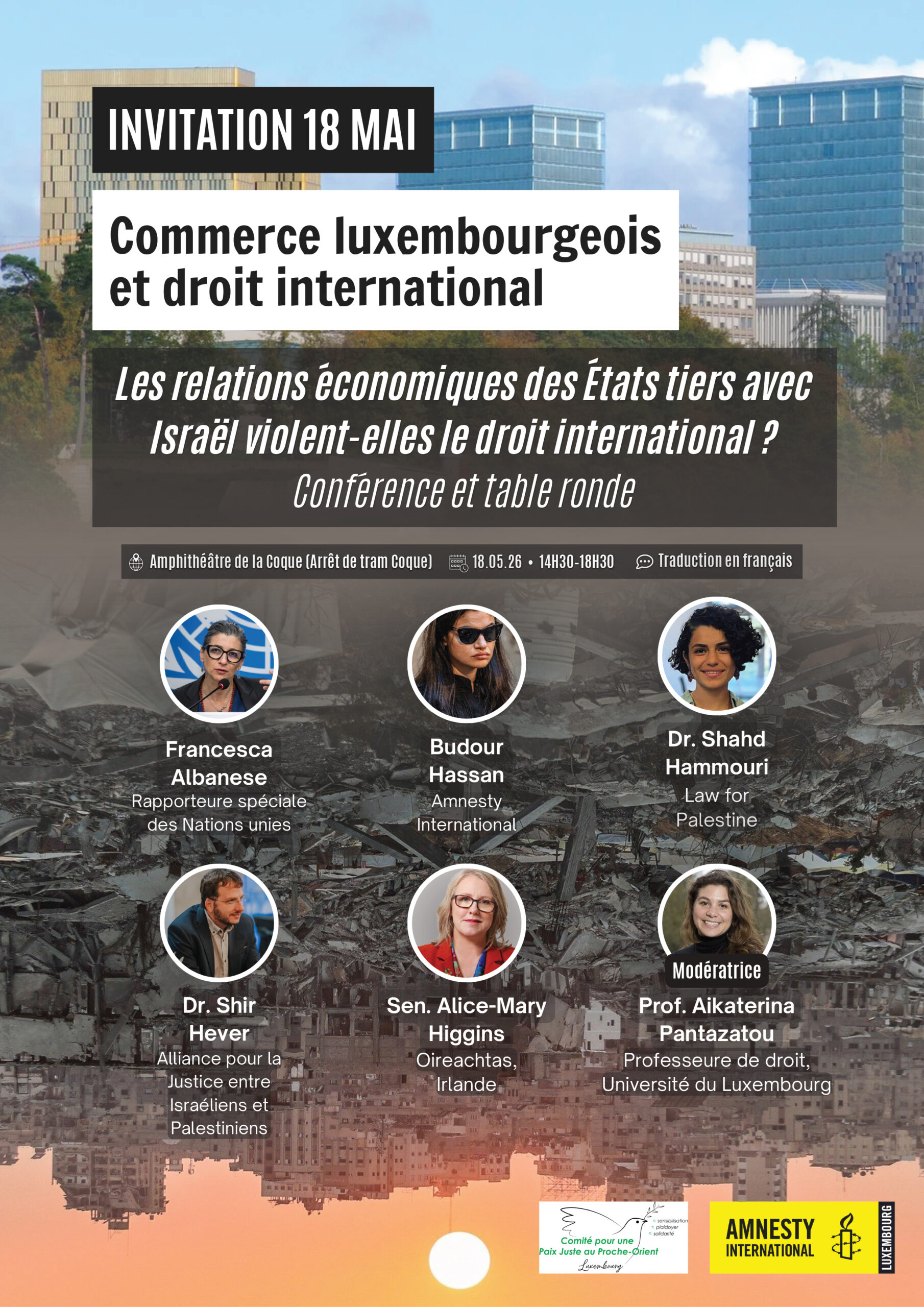 Ce symposium examine la tension cruciale entre la défense juridique inébranlable des droits des Palestiniens par le Luxembourg et ses relations économiques avec Israël, susceptibles de cautionner des actes illicites. Il fait référence au rapport juridique de mars 2026 de l’Unité scientifique de la Chambre des députés du Luxembourg, qui analyse les responsabilités du Luxembourg au regard des normes les plus contraignantes du droit international. Ce rapport souligne l’obligation primordiale du Luxembourg de prévenir le génocide, de garantir la protection des droits humains et de gérer les risques de complicité, tout en présentant des mesures concrètes que le Luxembourg peut prendre unilatéralement pour aligner sa politique sur ces normes juridiques non négociables.