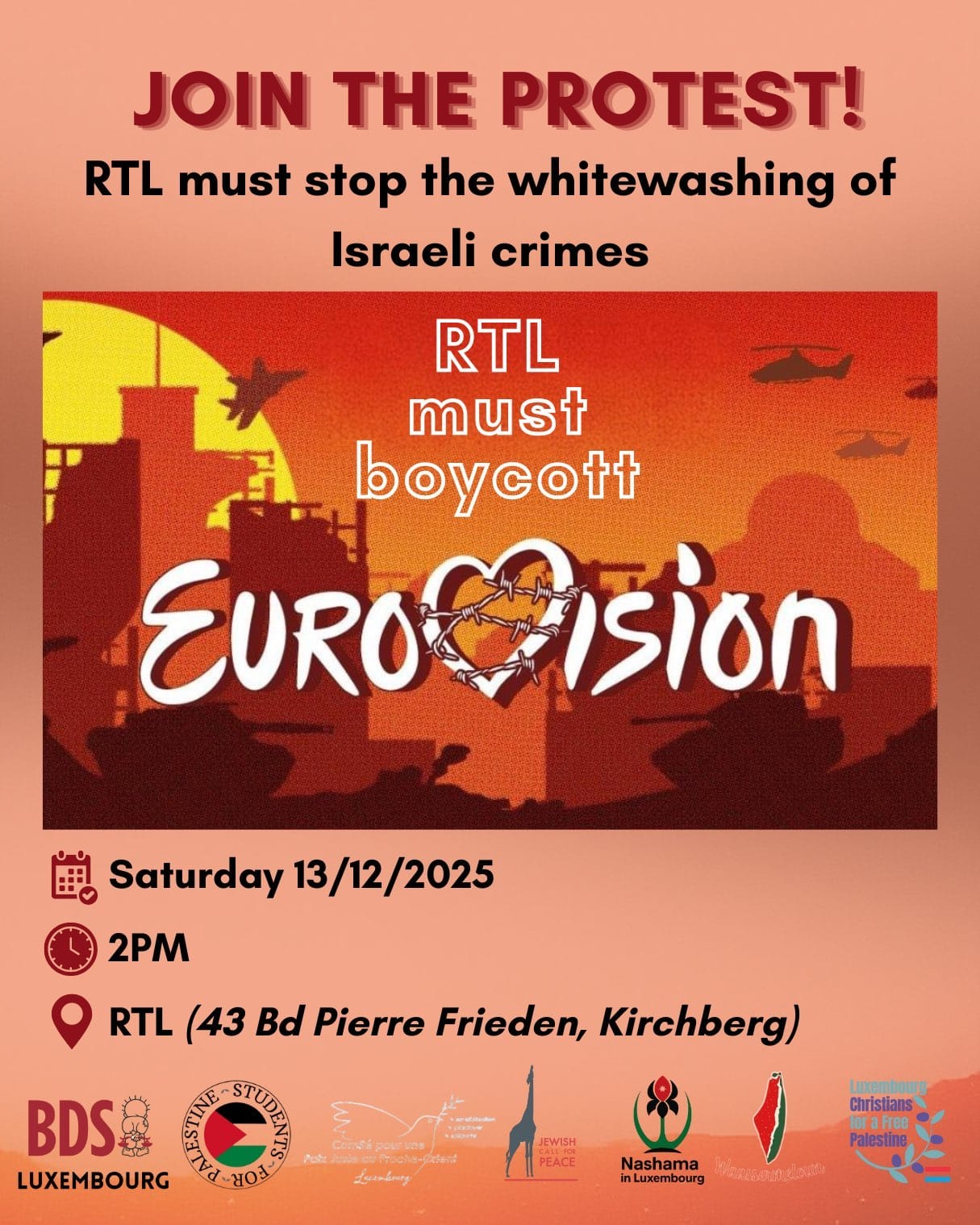 Ce samedi 13 décembre, le BDS mènera la manifestation hebdomadaire des Collectives. Pour soutenir le boycott de l’Eurovision 2026, nous nous rassemblerons à 14h00 devant le siège de RTL, à Kirchberg.