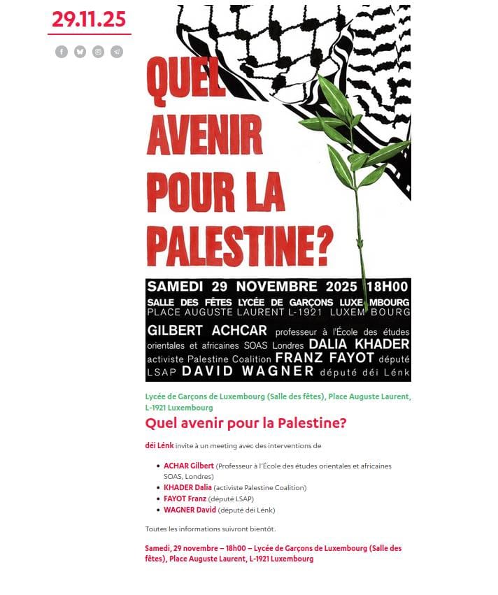 Le CPJPO tient à vous signaler et à vous inviter à la conférence très intéressante organisée par déi Lénk le samedi 29 novembre 2025 à 18h00 au Lycée de Garçons à Luxembourg/Limpertsberg sur le sujet «Quel avenir pour la Palestine ?».
